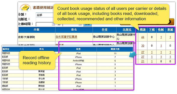 The platform is compatible with various e-book file formats that can be uploaded to PC, iPad, iPhone and Windows systems tablets and mobile phones, giving an edge in cross-carrier support. Complete records, statistical analysis of user reading and testing history, and supports recording of offline reading history allowing the administrator a grasp of the user's reading history through matching and cross referencing reports.